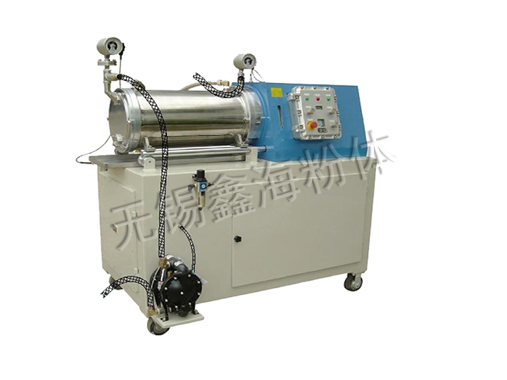 利用料泵将经过搅拌机预分散润湿处理后的固-液相混合物料输入筒体内,物料和筒体内的研磨介质一起被高速旋转的分散器搅动,从而使物料中的固体微粒和研磨介质相互间产生强烈的碰撞、摩擦、剪切作用,达到加快磨细微粒和分散聚集的目的。研磨分散后的物料经过动态分离器分离研磨介质,从出料管流出。卧式砂磨机特别适合分散研磨粘度高且粒度要求细的产品。