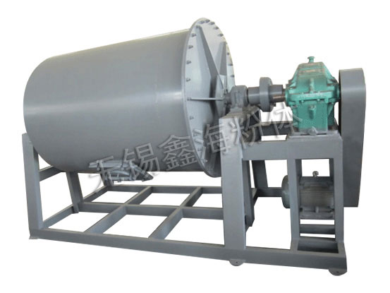 为卧式筒形旋转装置,外沿齿轮、链轮或皮带传动,两仓格子型球磨机。物料由送料机经入料中空轴螺旋均匀地进入球磨机仓,内装三种不同规格的球介,筒体转动产生离心力将球介带到一定高度后落下,对物料产生重击和研磨作用。物料在仓达到粗磨后,经单层隔仓板进入第二仓,该仓内装有四种不同规格的球介,将物料进一步研磨。粉状物通过出料口筛栏板排出,进入振动筛粉机进行分级完成粉磨作业。