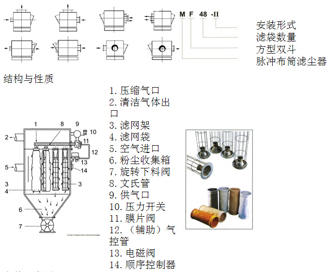 含尘气流从进气口进入下箱体后,部分沉降,轻微粉尘浮动时被滤袋阻留,净化空气透过滤袋,经文氏管进入上箱体,从出气口排出。