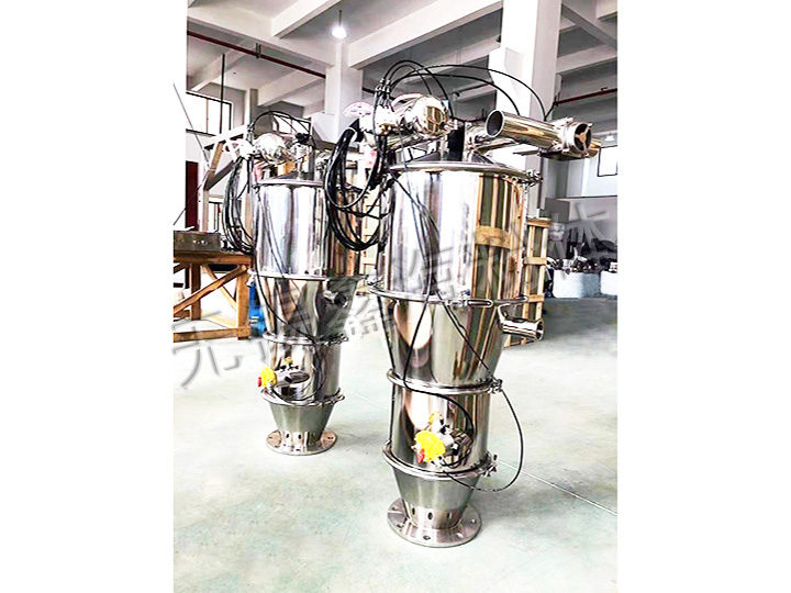 真空上料机中装有压缩空气反吹装置,每次放料时,压缩空气脉冲反吹过滤器,把吸附于过滤器表面的粉末打落下来,以保证吸料能正常运行。